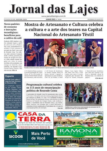 A 11ª Mostra de Artesanato e Cultura de Resende Costa, Minas Gerais, que já se sobressai no calendário cultural e turístico da cidade e da região, é o destaque da edição de junho/2025 do Jornal das Lajes. Reconhecida Capital Nacional do Artesanato Têxtil, a cidade reafirmou sua identidade com uma programação que incluiu oficinas, exposições, […]