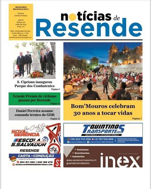 A celebração dos 30 anos do Grupo de Bombos “Bom’Mouros”, da freguesia de S. Martinho de Mouros, é o principal destaque de capa da edição de junho do jornal Notícias de Resende. Diversas atividades, dia 21 de junho, marcaram um percurso de dedicação à música tradicional e à cultura local. Composto por 14 elementos, com […]