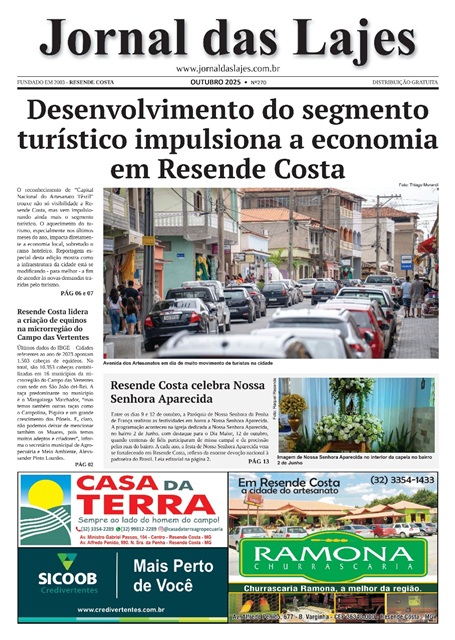 A maior visibilidade de Resende Costa (MG) e o impulsionamento do segmento turístico, fruto do reconhecimento de “Capital Nacional do Artesanato Têxtil”, são o destaque da edição de outubro do Jornal das Lajes. O aquecimento do turismo, especialmente nos últimos meses do ano, impacta diretamente a economia local, sobretudo o ramo hoteleiro. Reportagem especial mostra […]