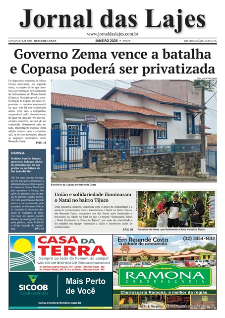 A aprovação, em segundo turno, do projeto de lei que autoriza a privatização da Companhia de Saneamento de Minas Gerais (Copasa), por parte dos deputados estaduais, é o principal destaque de capa da edição de janeiro/2026 do Jornal das Lajes, de Resende Costa. O projeto prevê a transformação da Copasa em uma corporation — modelo empresarial no […]